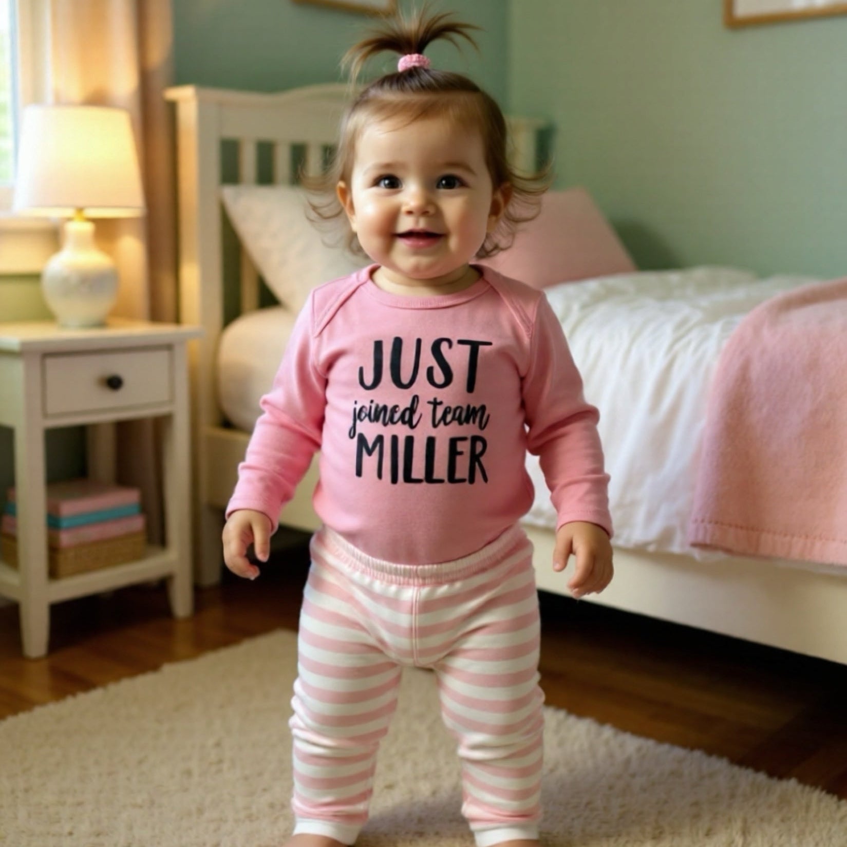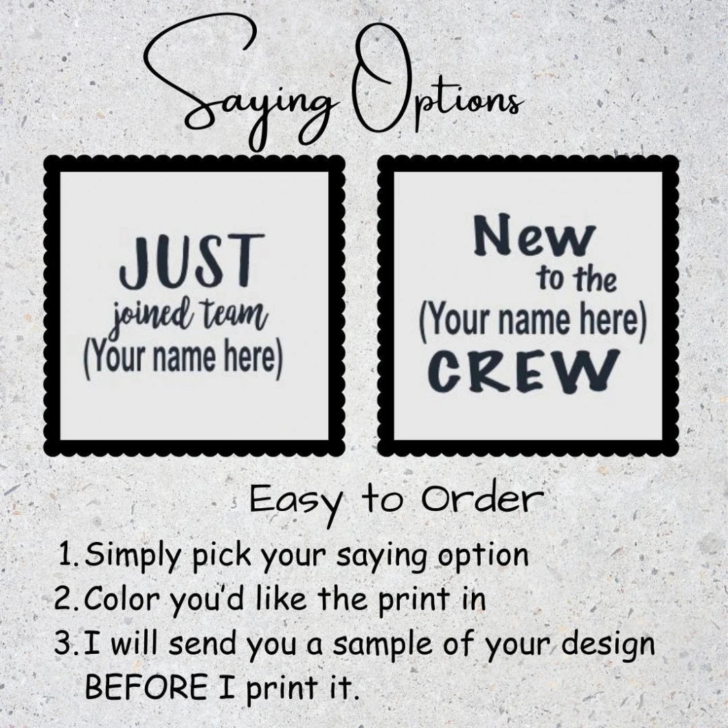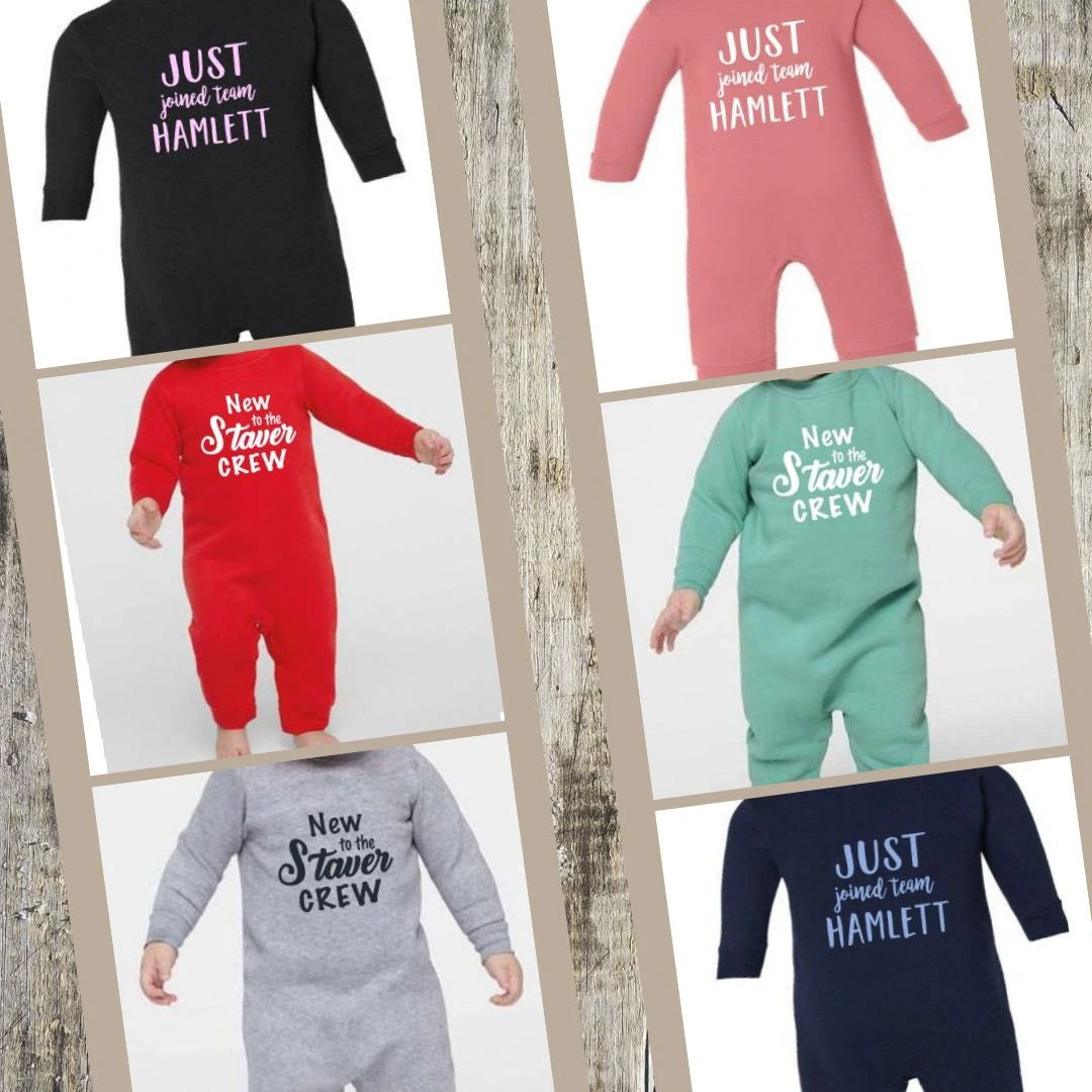 Simply pick the saying you'd like, let me know what name you'd like to use and the color of the logo. color options are in the picture area. Available now in size 6 or 12 months. There is 6 different colors to pick from - Navy, Red, Mauve, Black, Grey or mint.
