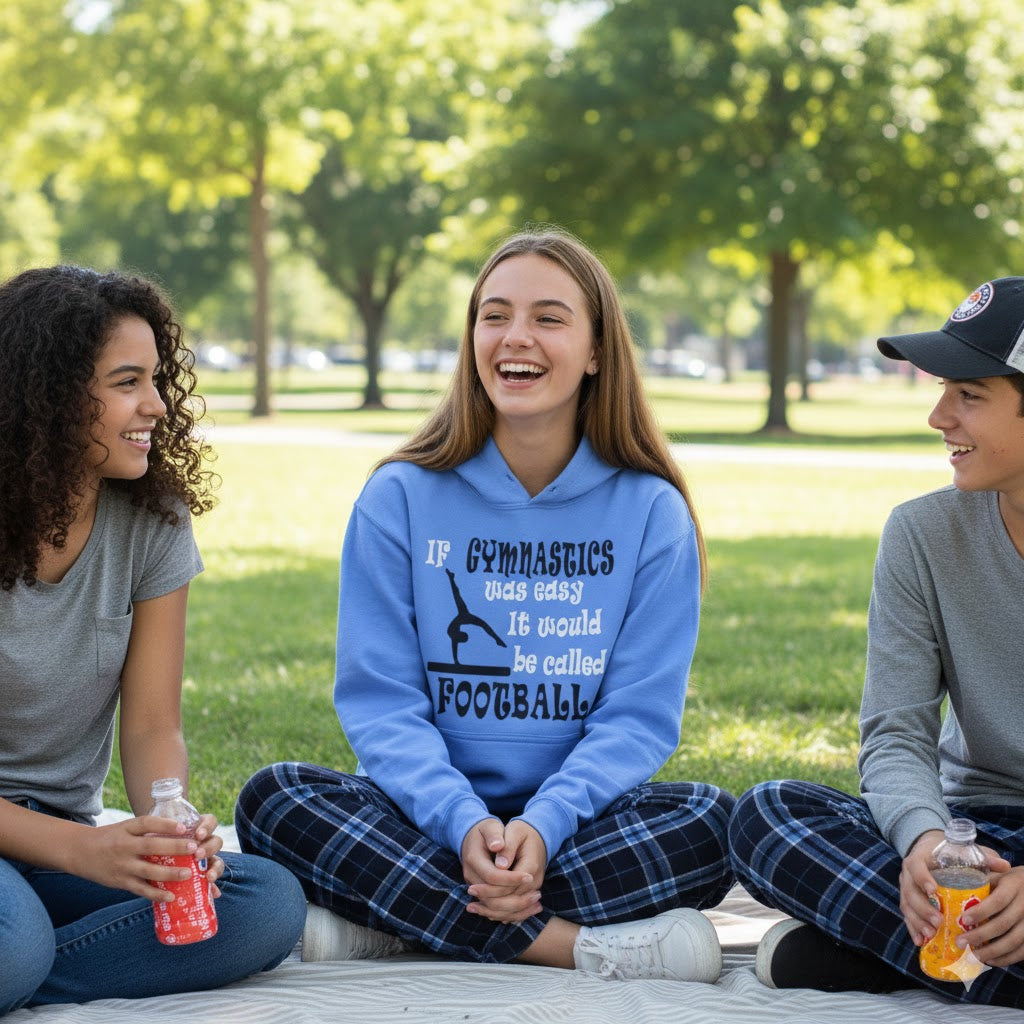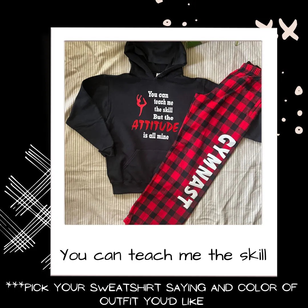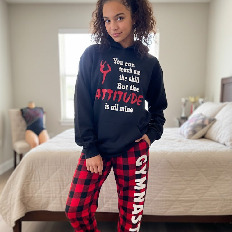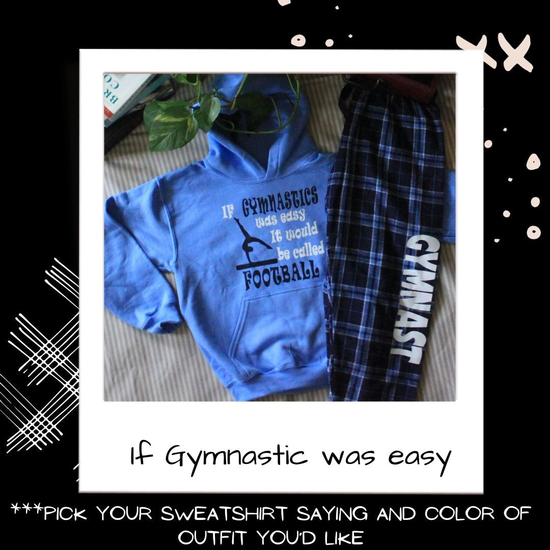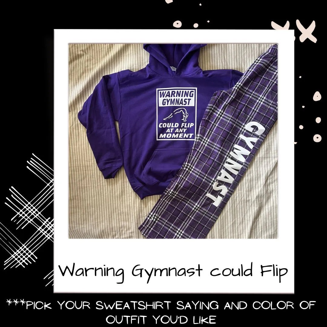 Perfect for the gymnast in your life! This cozy combo pairs soft flannel pants with a comfy hoodie sweatshirt—ideal for lounging after practice or cheering on teammates. The relaxed fit lets you move freely, while the playful design celebrates your passion for gymnastics. Whether you're unwinding at home or showing off your athletic spirit, this set keeps you comfortable and stylish.
