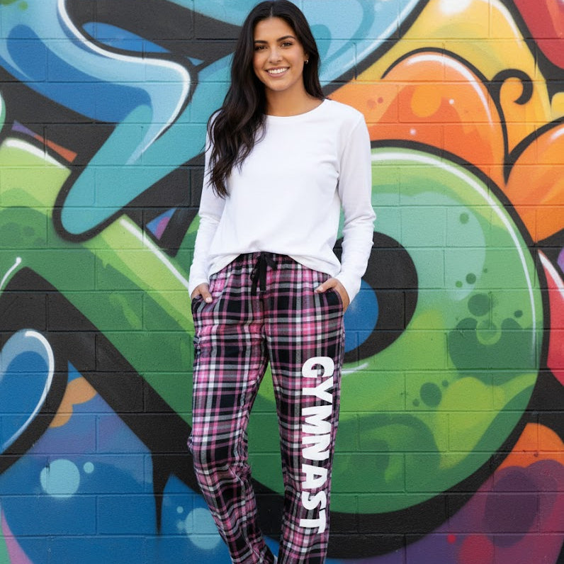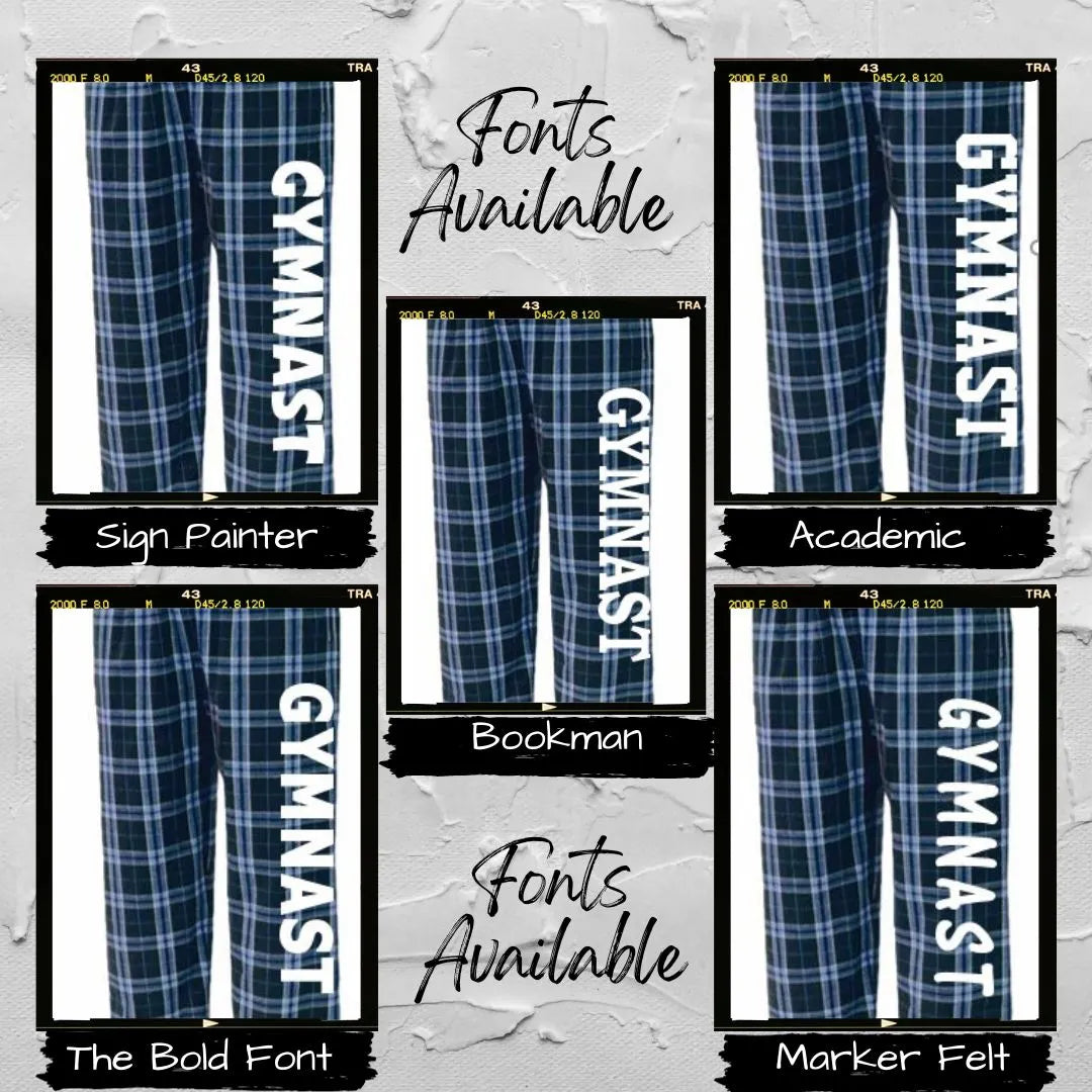Super comfy Pennant Sportswear unisex flannel pants with GYMNAST running down the side of the leg in white printing. The flannel pants are Pennant Sportswear brand, very soft, comfy and warm. They are 100% cotton they do run long but will shrink after you wash them 1-2 inches since they are 100% flannel.