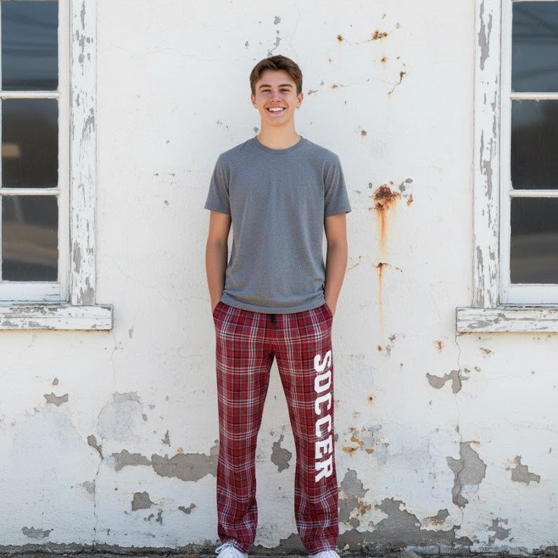 Person wearing a gray t-shirt and red plaid pants with 'soccer' text, standing against a weathered wall.